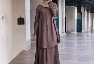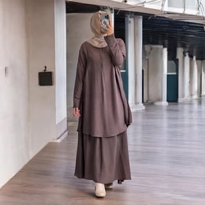 Tunik + Rok bahan Polo Linen, all size (M-XXL), LD 125 cm, P tunik 100 cm, P rok 100 cm. Busui & wudhu friendly. Cocok untuk BB 55-75 kg, tinggi 155-170 cm.