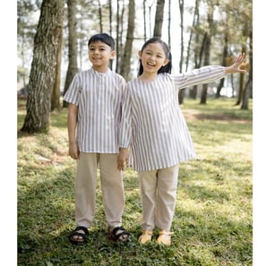 Bahan katun, motif striped, kancing eksklusif. Ukuran 1-12 tahun, kemeja (30x44 cm - 47x63 cm), celana (20x49 cm - 27x87 cm). Toleransi ±2 cm.