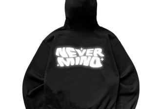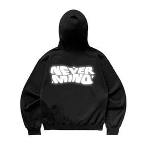 Hoodie Boxy Never Mind: Bahan fleece 280 gsm, sablon, tanpa tali, cutting boxy. Ukuran M-XXL (P 65-73 cm, L 62-67 cm). Toleransi ±2 cm.