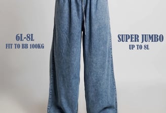 Celana kulot jeans ringan berbahan denim 6.5 oz, adem, dan non-stretch, pinggang karet elastis dan tali serut. Ukuran 6L (Pinggang 70-124 cm, Panjang 98 cm, BB ≤90 kg) dan 8L (Pinggang 72-126 cm, Panjang 99 cm, BB ≤100 kg).